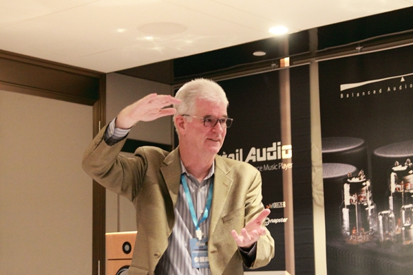 首先,请出的是来自音乐之都奥地利维也纳的Ayon Audio爱咏CEO兼设计师Gerhard Hirt先生,这个品牌对于资深发烧友来说其实并不陌生,他用音乐说话通过Ayon Auris ll 前级、CD-35 Signature SACD、EPSILON EVO Mono单声道胆后级、CD-T ll CD转盘、STRATOS 解码、S-10 II 数字播放器、BLACK RAVEN 音箱、BLACK CRANE 旗舰音箱等器材播放两首曲目来阐述Ayon Audio的音响理念,在电子管与晶体管之间,他更倾向于胆机,因为胆机更擅长于对音乐的表达,所以Ayon Audio更专情于研发胆机,但胆机的缺点在于很难找到能够推得尽善尽美的音箱。Ayon Audio音箱的研发推出正是为了完成这一使命,音箱弧面造型的箱体采用多层木板压制而成,其胶合材料采用和意大利小提琴制作一样的天然树胶,通过弧面设计消除驻波所以箱体内部是零吸音物料,这带来了高效率多细节的好处,同时与德国Accuton合作研发了特殊的陶瓷单元以及优化分频器,使得音箱灵敏度高达93dB,且音乐曲线不做任何修整,这是为胆机而生的音箱。当然Ayon Audio的音箱并非单一性的,背部的一个小开关可供玩家在电子管与晶体管之间做出选择。