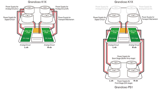 在供电设计上,根据原厂提供的说明资料, K1X 本身具备 4 组环形变压器,分别提供转盘机构、数位线路、左声道类比线路、右声道类比线路。但是,好还要更好!PS1 也用上了 4 组环形变压器,但这次只提供给 K1X 的左、右声道类比线路使用,而且进一步将每声道拆分为 D / A 数位类比电路与 Buffer Amp 缓冲扩大线路各自独立供电。而数位线路与转盘机构的电源仍由 K1X 内部的变压器负责供应。目的是为了让类比与数位讯号更加分离,消除彼此之间的干扰,同时确保电源供应与改善讯噪比。