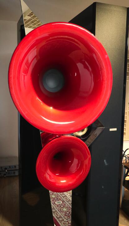 Acapella 阿卡佩拉次旗舰音箱Triolon MK5-6没有使用旗下独创的偏圆心中高音号角单元,而是采用两只大尺寸的中音、中低音号角单元(46厘米的中音号角以及78厘米的中低音号角)。Acapella 阿卡佩拉号角的最大特色就是不采用压缩驱动器。这样可以真实还原出现场的乐器,特别是铜管号角的发声,音箱需要具备强大的音乐能量与形体及穿透力。