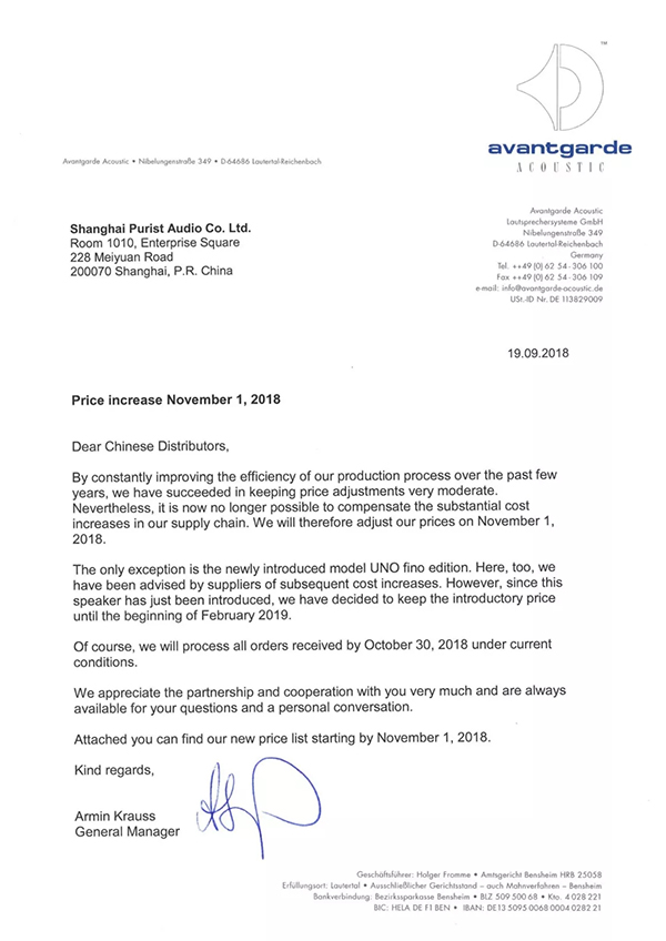 2018年11月1日起,喇叭花Avantgarde产品,包括全系号角扬声器(新品UNO FINO维持原价至2019年2月)、XA系列放大器,全球上涨零售价格。