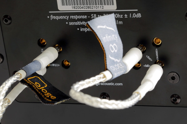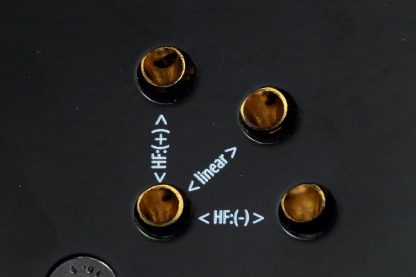 Ologe Acoustic ONE V2背板上的音量调整可分为两个部分,左边负责高频段的量感,共有“HF:(+)”、“linear”与“HF:(-)”三个接点。若要让喇叭拥有平直的频率响应曲线,可以将跳线接在“linear”的位置;若样让高音量感多一些,则可接在““HF:(+)”,相反地,若要高音少一点,则可接在“HF:(-)”的位置上。