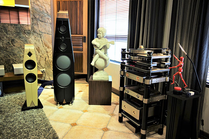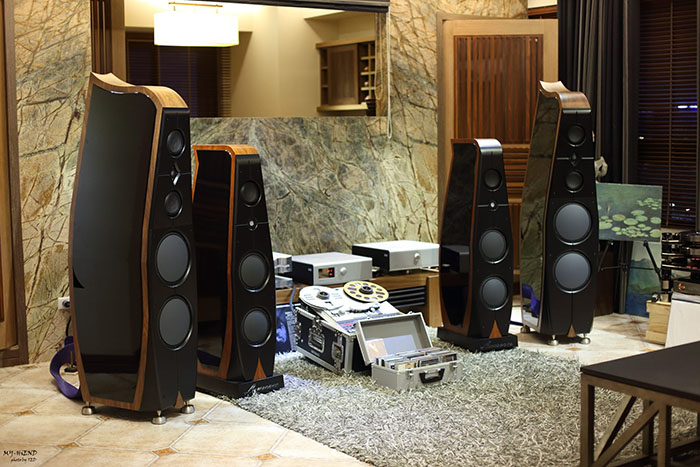左方喇叭为Bird Penguin、右方喇叭为Dragon。Dragon为三音路设计,前有Jantzen钻石高音,後有Accuton陶瓷高音,搭配Accuton陶瓷中音与低音单体,分音器为4阶分音,使用高品质MKP电容、纯OFC导线、军规电感与金属薄膜电阻,劳伦斯音响CEO也是设计师的Lawrence Liao先生说分音器是最新设计而且是好声音的关键。