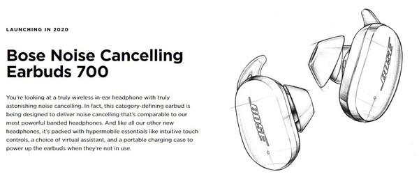 另一款Bose Earbuds 700上则明确宣布了其具有降噪功能,Bose声称其具备“可与其最强的头戴式耳机相媲美的降噪功能”。这款产品同样支持触摸控制和智能语音助手。除上述信息外,Bose并没有提供任何其它规格以及价格或具体的发售时间,只告诉这两款产品会在2020年面世。