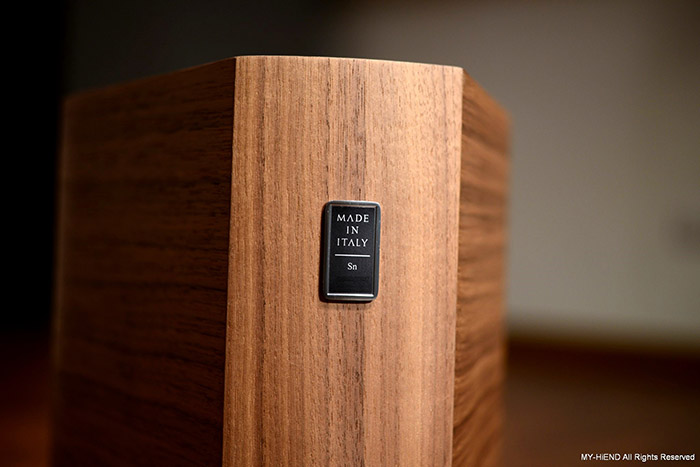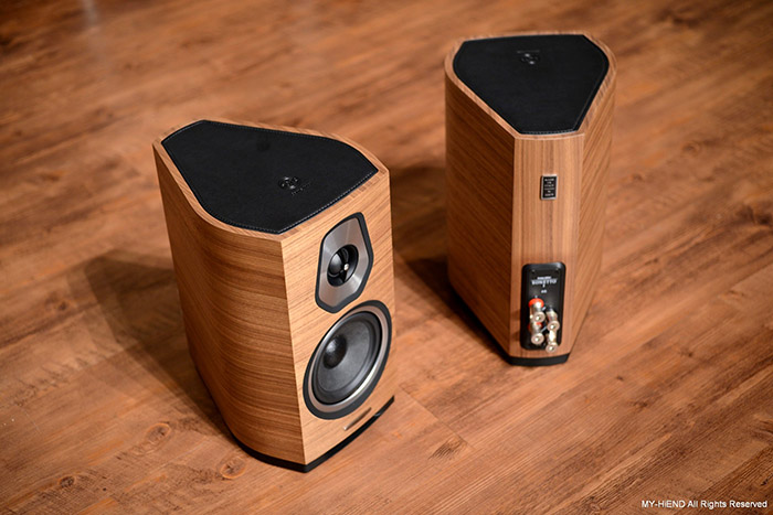 这对是Walnut胡桃木的版本,跟之前来我们这的Sonetto VIII落地喇叭是一样的颜色,我觉得这颜色非常好看,上一次评测的Sonetto II书架则是纯白版本,有另一种现代之美。喇叭本体为鲁特琴(Lute)的造型,有着诱人的线条,而更重要的是这种不规则的箱体设计,对声音也是有绝对正面的帮助,能将美观与声音结合的这麽自然天成,只有极少数像Sonus Faber这样的经典大厂才做得到了。