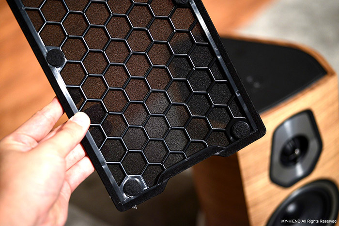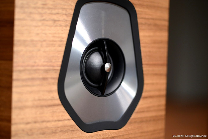 反射孔在喇叭底部,并非一般常见的圆孔,而是一个长条型的,开口朝前,喇叭可靠墙摆位也不会有太多驻波、反射问题。喇叭底座已有预留孔位可与专用的脚架结合,上次我们评测Sonetto II书架喇叭也有原厂脚架,大家可以参考上次的评论(http://my-hiend.com/wp/?p=28165),这次代理就没有送脚架来,用得是我们自己的,如果可以的话,我强烈建议一定要跟原厂脚架一起买,漂亮好声,具整体性。