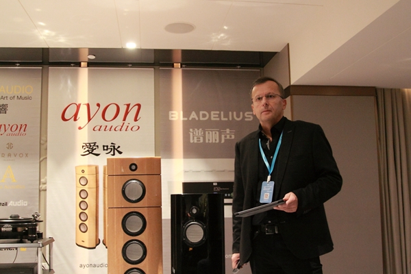首先,请出的是来自音乐之都奥地利维也纳的Ayon Audio爱咏CEO兼设计师Gerhard Hirt先生,这个品牌对于资深发烧友来说其实并不陌生,他用音乐说话通过Ayon Auris ll 前级、CD-35 Signature SACD、EPSILON EVO Mono单声道胆后级、CD-T ll CD转盘、STRATOS 解码、S-10 II 数字播放器、BLACK RAVEN 音箱、BLACK CRANE 旗舰音箱等器材播放两首曲目来阐述Ayon Audio的音响理念,在电子管与晶体管之间,他更倾向于胆机,因为胆机更擅长于对音乐的表达,所以Ayon Audio更专情于研发胆机,但胆机的缺点在于很难找到能够推得尽善尽美的音箱。Ayon Audio音箱的研发推出正是为了完成这一使命,音箱弧面造型的箱体采用多层木板压制而成,其胶合材料采用和意大利小提琴制作一样的天然树胶,通过弧面设计消除驻波所以箱体内部是零吸音物料,这带来了高效率多细节的好处,同时与德国Accuton合作研发了特殊的陶瓷单元以及优化分频器,使得音箱灵敏度高达93dB,且音乐曲线不做任何修整,这是为胆机而生的音箱。当然Ayon Audio的音箱并非单一性的,背部的一个小开关可供玩家在电子管与晶体管之间做出选择。