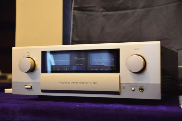 E-380则是一部具有AB类120W/8欧姆(180W/4欧姆)输出能力的高级合并功放,输出能力比上一代机型E-370提高了20%,而采用160V/15A高电压高电流的功率晶体管,性能较E-370大幅提升。而且进一步改良了左右声道全对称AAVA高精度音量控制线路,在任何音量水平下都能提供更线性的音乐重播,不会丢失任何的细节。改良的低输出阻抗功放线路的阻尼系数更提升25%到500,进一步提升对音箱的控制能力。同时机身背部也提供两组拓展卡槽,可供玩家选购所需的功能。面板提供两个经典的指针式输出电平指示表,更增加了对应PC Audio格式的MHz显示。电源供应线路同样有大幅提升,采用大型变压器和两个33000供电μF的高容量音响级电解电容组成强大的供电性能。超低噪音的设计,令噪音电平较E-370改善了20%,达到仅4.2μV。功率输出保护线路源于A-250的设计,采用内阻仅2.0mΩ的MOS-FET场效应管作保护,确保声音细节不丢失,动态更出色。访问尾声,铃木雅臣先生为我演示了E-380优秀的声音表现,纯净的背景、干净优雅的音质和强大的控制力,全方位展示了金嗓子新一代旗舰合并功放不俗的素质。