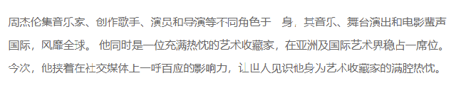 但是担任全球顶尖艺术拍卖展的策展人,还是有人质疑,周杰伦有这个资格吗?面对质疑,苏富比官网给出了这样的回应: